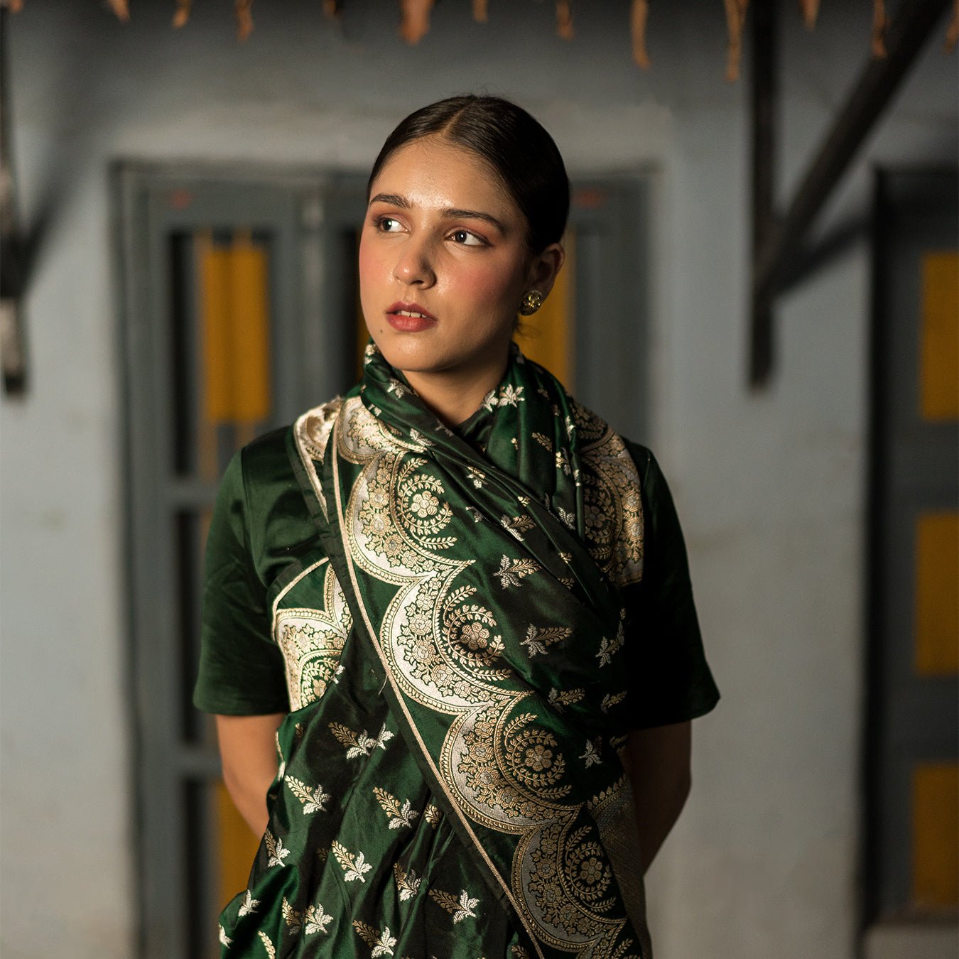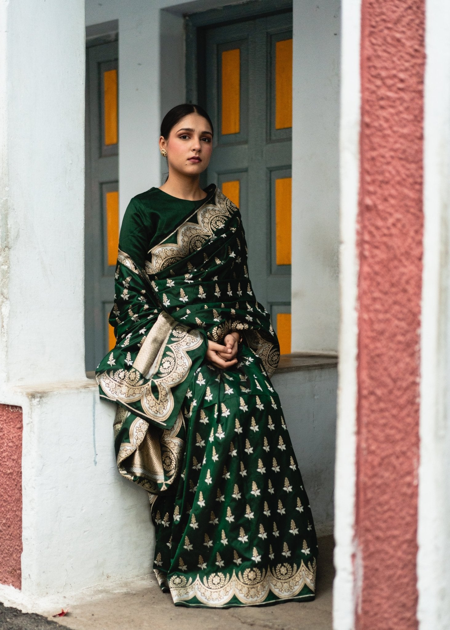Aarzoo is a green kataan silk saree that features a tilfi weave. Made in Varanasi, this saree is handwoven with intricate details across her borders and floral butas all over. The model wears a custom-made blouse, made to order. The saree comes with a running blouse. The saree is from the taana~baana collection. Slight variations in colour and weave are natural due to the handwoven nature of the fabric. This product is available in made-to-order, and takes 15-20 days for dispatch.